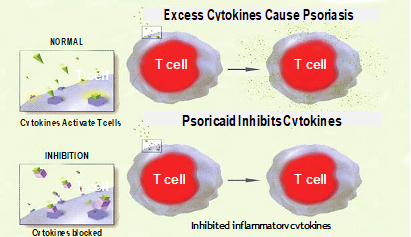 Η ψωρίαση επηρεάζει μεταξύ 2% - 2,6% του αμερικανικού πληθυσμού και χαρακτηρίζεται από την έκρηξη κοκκινωπό, αργυρόχρωμες προσκρούσεις και αλλοιώσεις. Η κατάσταση συμβαίνει στους αγκώνες, τα γόνατα, το τριχωτό της κεφαλής και τον κορμό. αυτά τα χτυπήματα μπορεί να γίνουν παχύρρευστα και γεμάτα με πύμνη ενώ παράλληλα οδηγούν σε ξεφλούδισμα και ερεθισμό του δέρματος. Η ψωρίαση, η ρευματοειδής αρθρίτιδα και άλλες αυτοάνοσες παθήσεις είναι κυρίαρχες διαταραχές T helper 1 (Th1) (βλέπε Πίνακα 1), όπου ο οργανισμός παράγει περίσσεια κυτοκινών τύπου Th1 (βλέπε Πίνακα 2). Διάφορες μελέτες έχουν δείξει ότι το Psoricaid αναστέλλει αυτές τις κυτοκίνες, καθιστώντας το ωφέλιμο για Th1 κυρίαρχες διαταραχές. Περαιτέρω μελέτες έχουν δείξει ότι επίσης αναστέλλουν άλλους φλεγμονώδεις μεσολαβητές (Πίνακας 2) όπως λευκοτριένια (LTB4), παράγοντα δραστηριότητας αιμοπεταλίων, νιτρικό οξείδιο, κλπ. Σε κάποιο βαθμό, αναστέλλει επίσης κυτοκίνες τύπου Th2.